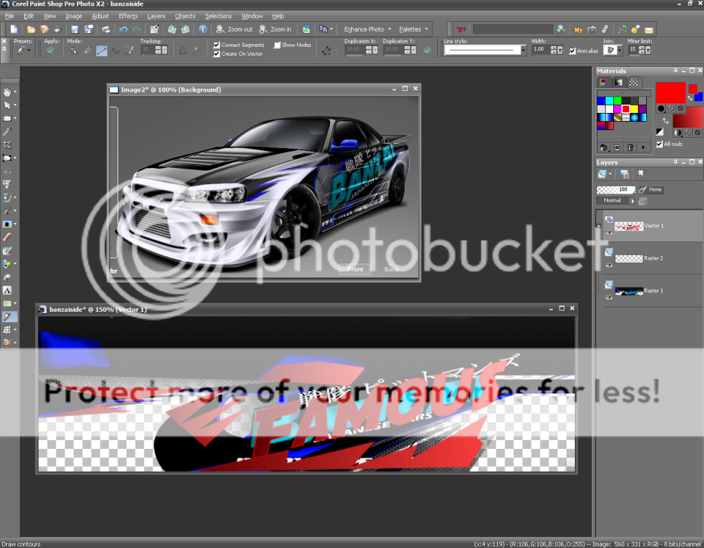 You could use gimp or Photoshop docent matter tools should be the same or similar, I am using corel paint shop pro x2. So here we go Tip #1. When making Graphics, for a car. Lets say a R34. Go on the free graphics section and find a set of graphics that have already been made for the R34. Then go on Nitto and put them on the car, and take a screen shot and open it in Photoshop. The same graphic from the Free graphics section you will use it as a template, For making your own graphics, And the SS, You will use as Guide also. They would help you look at Were things belong, So you wont have to keep going on Nitto and check how things are, Just crate a new layer on top of the template were you can put your work, Example ![]() Tip #2. Some times When you put graphics on a car, And you switch to the back view the graphics will move forward. Why does that happen? That happens because the template your are using is to long, So what you need to do to fix it Is use the crop tool and crop it a little to make it shorter. Tip #3 So you made some raw as graphics and you wanna Put them for sale on the forums? Don't Just take SS of the car and put it on the forum. That is boring, Do something to them that will make them sale! Def Jam is a great example Look what he does hope it helps. I will contine to post Tips, and tricks on Nitto Custom graphics. If you got any Tips on Nitto custom graphics, Please Post them here. If you have any questions on Nitto custom graphics ask Here! Me or other graphic designers could help you!!! Last edited by famousgilbert2 : 04-23-2013 at 07:44 AM. |